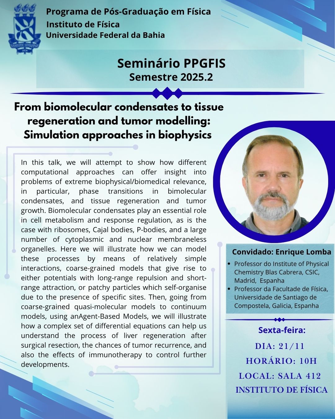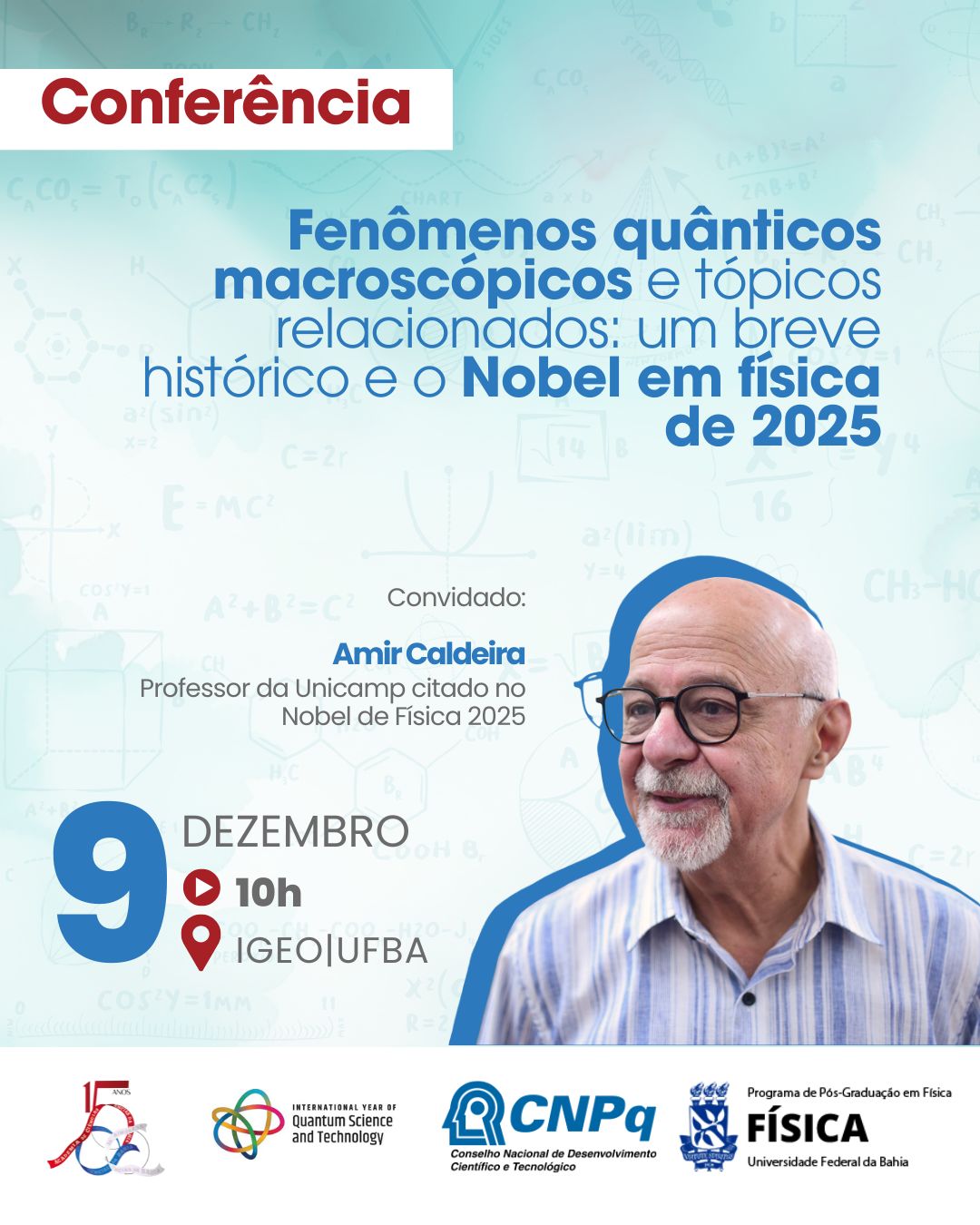 Teremos a honra de receber o Prof. Dr. Amir Caldeira (Unicamp), pesquisador citado no Nobel de Física de 2025, que ministrará um seminário sobre fenômenos quânticos macroscópicos e temas correlatos.